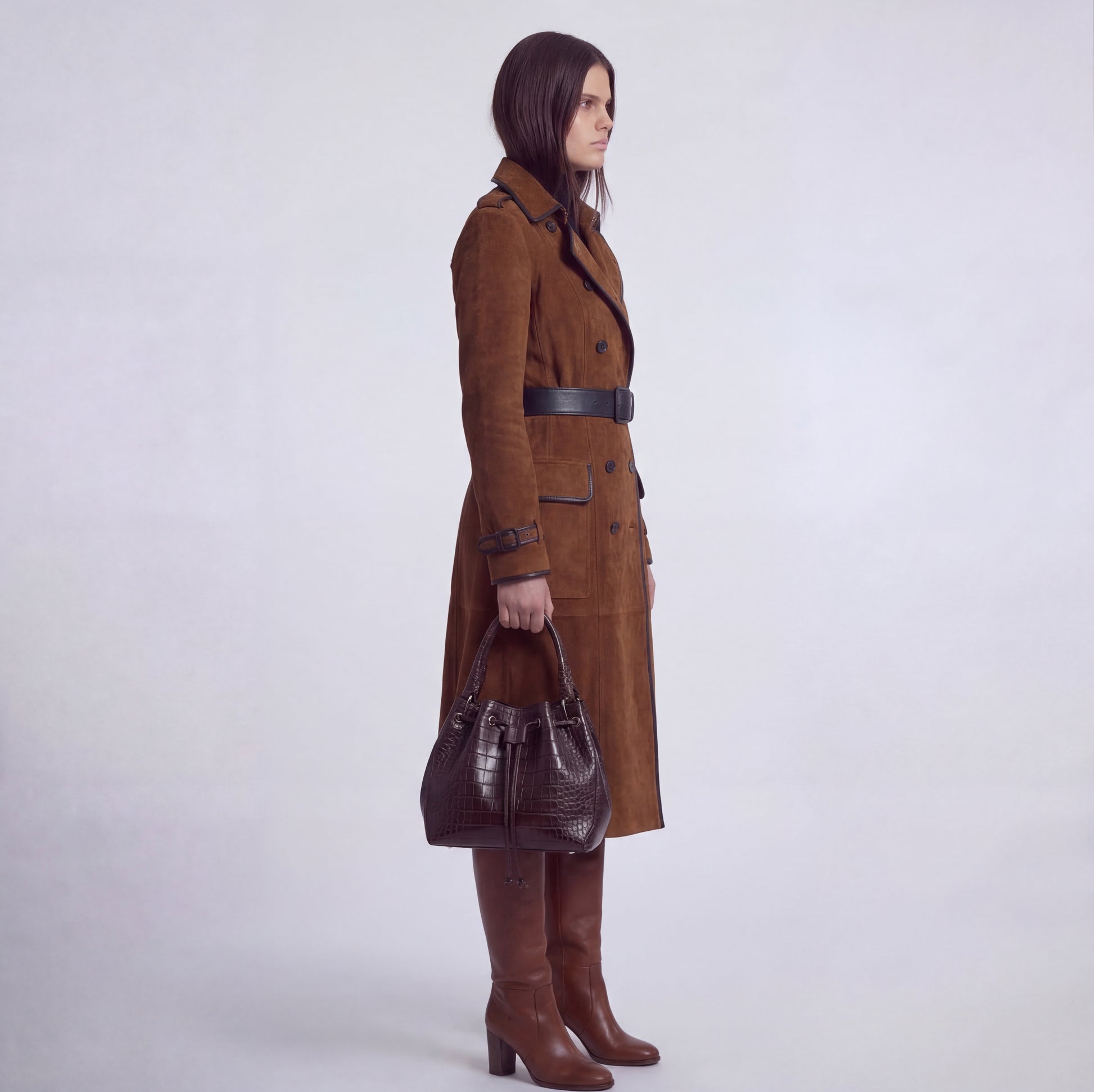 Un ejemplo de sofisticación atemporal, este abrigo largo color caramelo capta la atención con su silueta esculpida y su rica textura similar al ante. Su diseño cruzado y sus costuras a medida crean una impresión de serena fuerza, suavizada por la fluidez del movimiento. Su cálido tono terroso evoca el encanto otoñal y una serena confianza, combinando la inspiración vintage con un atractivo moderno. Ideal para mañanas animadas en la ciudad o escapadas de fin de semana refinadas, completa cualquier look con una elegancia discreta.